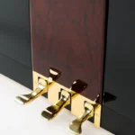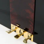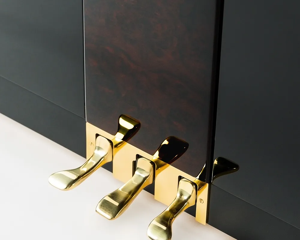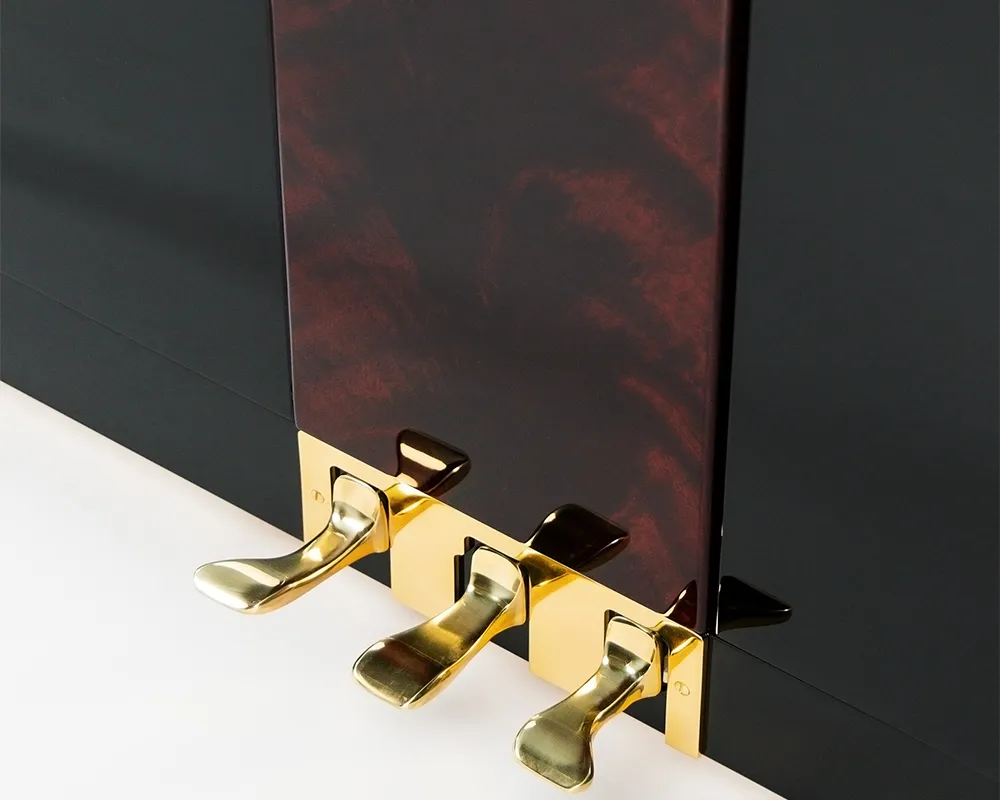 Die traditionellen Formen des Klaviers erfährt eine Aufwertung durch eine Edelholzapplikation und einen massiven Messing-Pedaltrittschutz. Diese sorgfältig ausgewählten Details verleihen dem Instrument einen edlen Charakter, der niemals aufdringlich wirkt. Erhältlich in edlen Hölzern wie Bubinga, Pyramidenmahagoni und Wurzelnussbaum – Bubinga ist sofort lieferbar.
