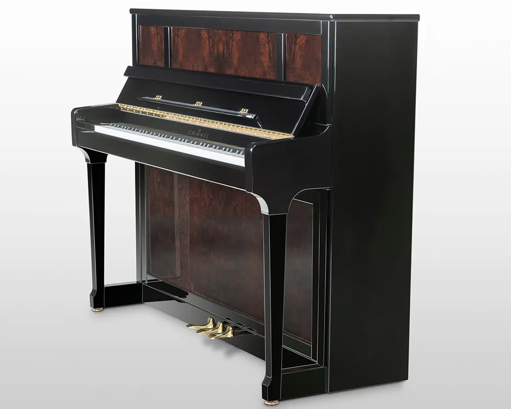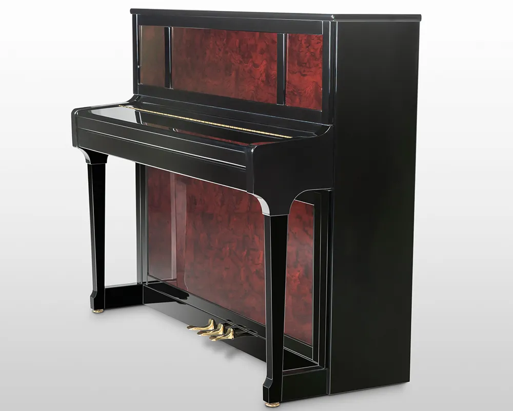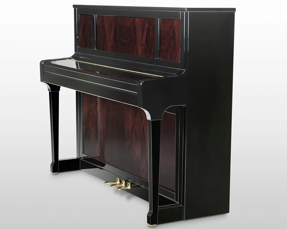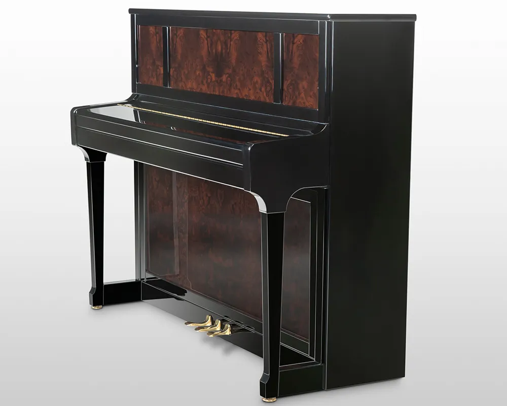 Seine Optik prägen großflächige Füllungen in den Klavierfronten mit ausgewählten Edelhölzern wie Bubinga, Pyramidenmahagoni und Wurzelnussbaum. Gefertigt in Braunschweig mit der präzisen Renner-Mechanik, bietet der C 121 Tradition Prestige ein unvergleichliches Musikerlebnis für anspruchsvolle Liebhaber.