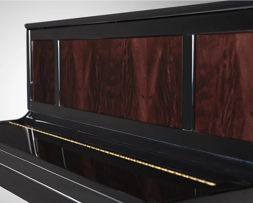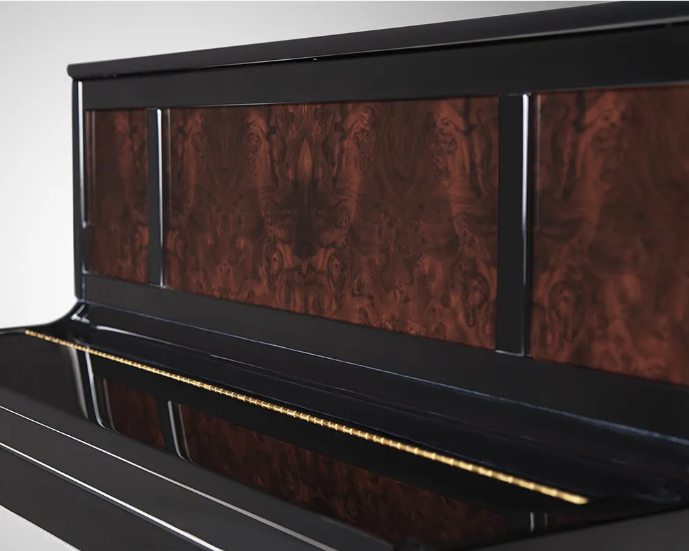Die Variante „Prestige“ setzt auf eine ganz besondere visuelle Aussage. Hier prägen großflächige Füllungen mit ausgewählten Edelhölzern die gesamte Optik der Klavierfronten. Diese sorgfältig gewählten Hölzer verleihen dem Instrument eine unvergleichlich edle Ausstrahlung. Sie können zwischen erlesenem Pyramidenmahagoni, ausdrucksstarkem Wurzelnussbaum oder dem warmen Bubinga wählen. Jede dieser Holzarten schenkt dem Klavier einen einzigartigen Charakter und macht es zu einem wahren Blickfang in jedem Raum.