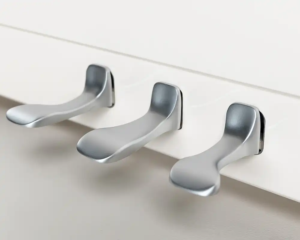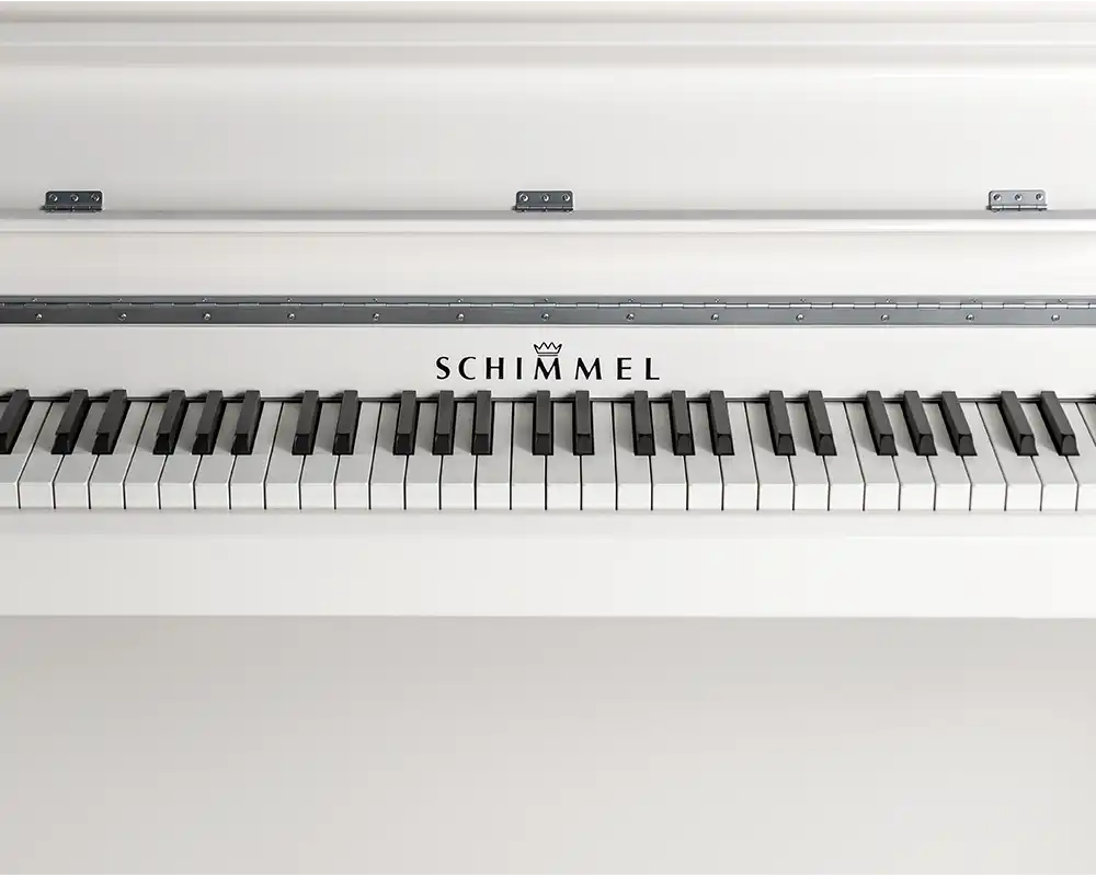 Das Herzstück des K 122 Elegance ist sein Anschlag. Die exklusiv gefertigte Schimmel Mechanik (made by Renner) bietet Ihnen einen perfekten Druckpunkt, der weder zu leicht noch zu schwer ist. Dieses Gleichgewicht sorgt sofort für ein Gefühl von Sicherheit und Kontrolle. Ob zartes Pianissimo oder kraftvolles Fortissimo – die Dynamik ist jederzeit hervorragend beherrschbar. Eine Besonderheit dieses Modells sind die Tastenbeläge: Während die weißen Tasten mit einem hochwertigen Mineral-Belag versehen sind, bestehen die schwarzen Tasten aus echtem Ebenholz. Dies verleiht dem Spiel eine besonders edle und griffige Haptik.