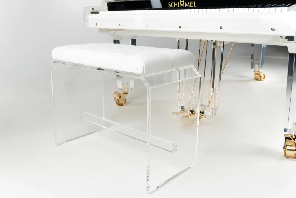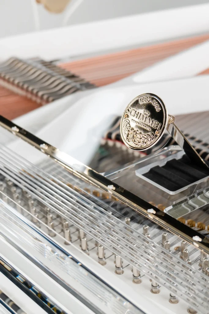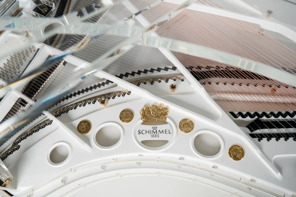 In Klang, Spielbarkeit und Technik steht er seinen klassischen Brüdern in nichts nach. Die perfekte Symbiose aus Spielwerk und Klangkörper überzeugt anspruchsvolle Pianisten ebenso wie passionierte Hobbyspieler. Um die optische Leichtigkeit des transparenten Materials zu unterstützen, hat Schimmel den Gussrahmen, den Resonanzboden und die sichtbaren Holzelemente in einem leicht gebrochenen Weiß gehalten. Dies verleiht dem Flügel eine schwebende Eleganz. Wer es individueller mag: Auch jeder andere Farbton ist auf Anfrage lieferbar.