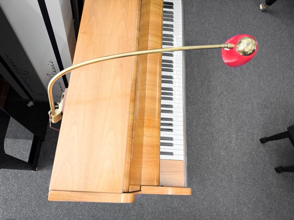 Träumen Sie von einem Instrument, das nicht nur musikalisch begeistert, sondern auch als stilvolles Möbelstück Ihr Zuhause bereichert? Dieses gebrauchte Schimmel Klavier in hellem Nussbaum-Furnier bietet genau das. Direkt aus der renommierten Pianofortefabrik Braunschweig, verkörpert es die Qualität und Eleganz, für die Schimmel weltweit bekannt ist. Mit seiner „kleinen Klaviergröße“ ist es eine wunderschöne Ergänzung für Ihr Zuhause oder Ihren Ausbildungsraum.